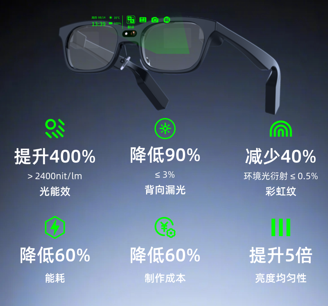 為戶外場(chǎng)景量身打造,追求極致亮度與續(xù)航表現(xiàn)。立訊精密和東南大學(xué)、南京平行視界技術(shù)有限公司聯(lián)合推出的PVG單綠AR眼鏡,展現(xiàn)了在光學(xué)技術(shù)上的一種極致探索。
