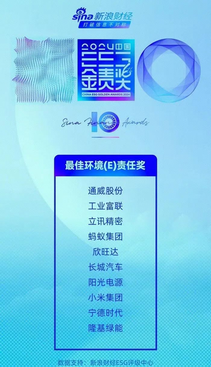 1月16日,由新浪財經(jīng)主辦的2024企業(yè)ESG“金責獎”評選結果正式公布。經(jīng)ESG權威評級數(shù)據(jù)庫評分、公眾投票及專家評審委員會嚴格審核,立訊精密榮獲2024企業(yè)ESG“金責獎”——最佳環(huán)境(E)責任獎。
